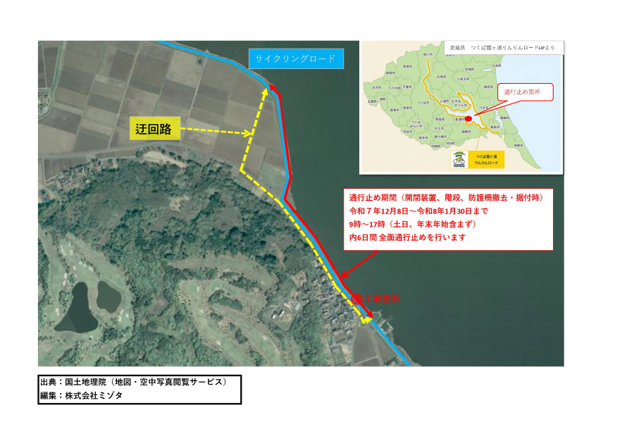 つくば霞ヶ浦りんりんロードの一部区間(美浦村)で、樋管工事が実施されます。