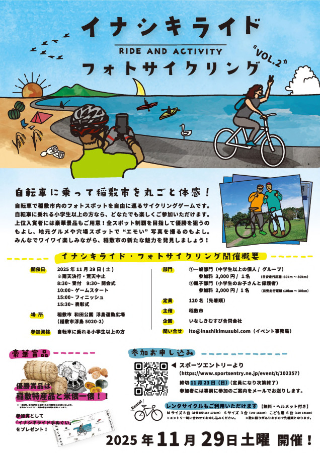 2025年11月29日(土)に、稲敷市和田公園にて、「イナシキライド・フォトサイクリングvol.2」(主催:稲敷市)が開催されます💁