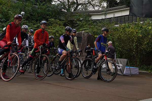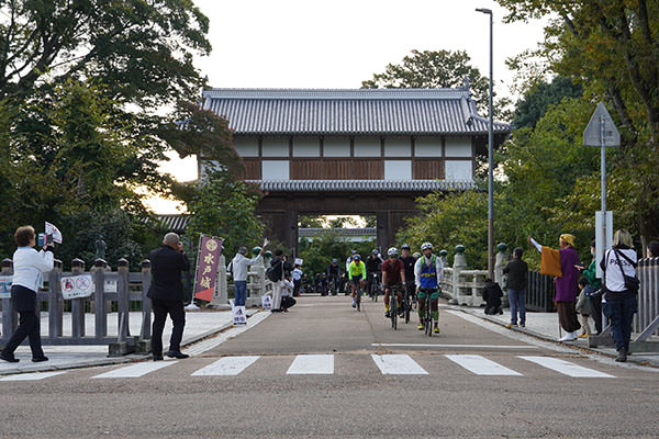 開門した大手門をくぐり、間隔をあけながら、グループごとに順次スタート。大手門付近では、地域の方々が応援旗を振って大声援と共にサイクリストを送り出してくださいました。