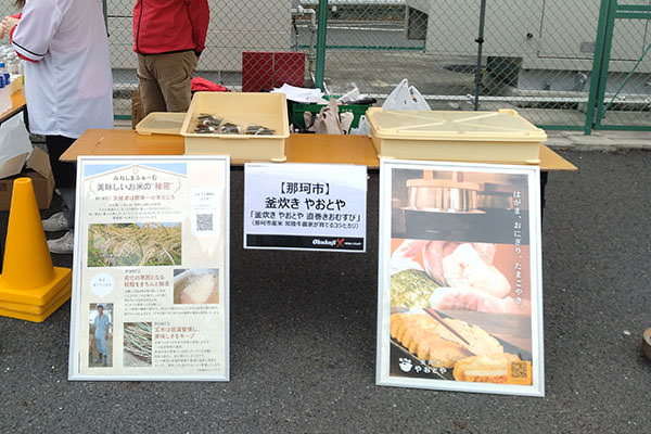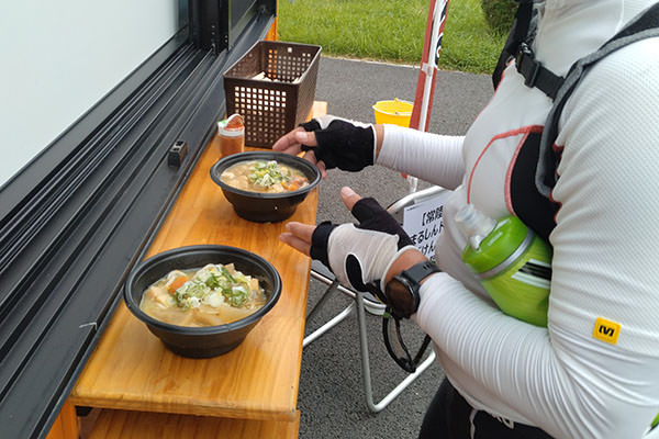 スタートから49.3km地点のエイドステーションでは、釜炊きやおとや「釜炊きやおとや直巻きおむすび」、まるしんドライブイン「けんちんそば」が提供されました。